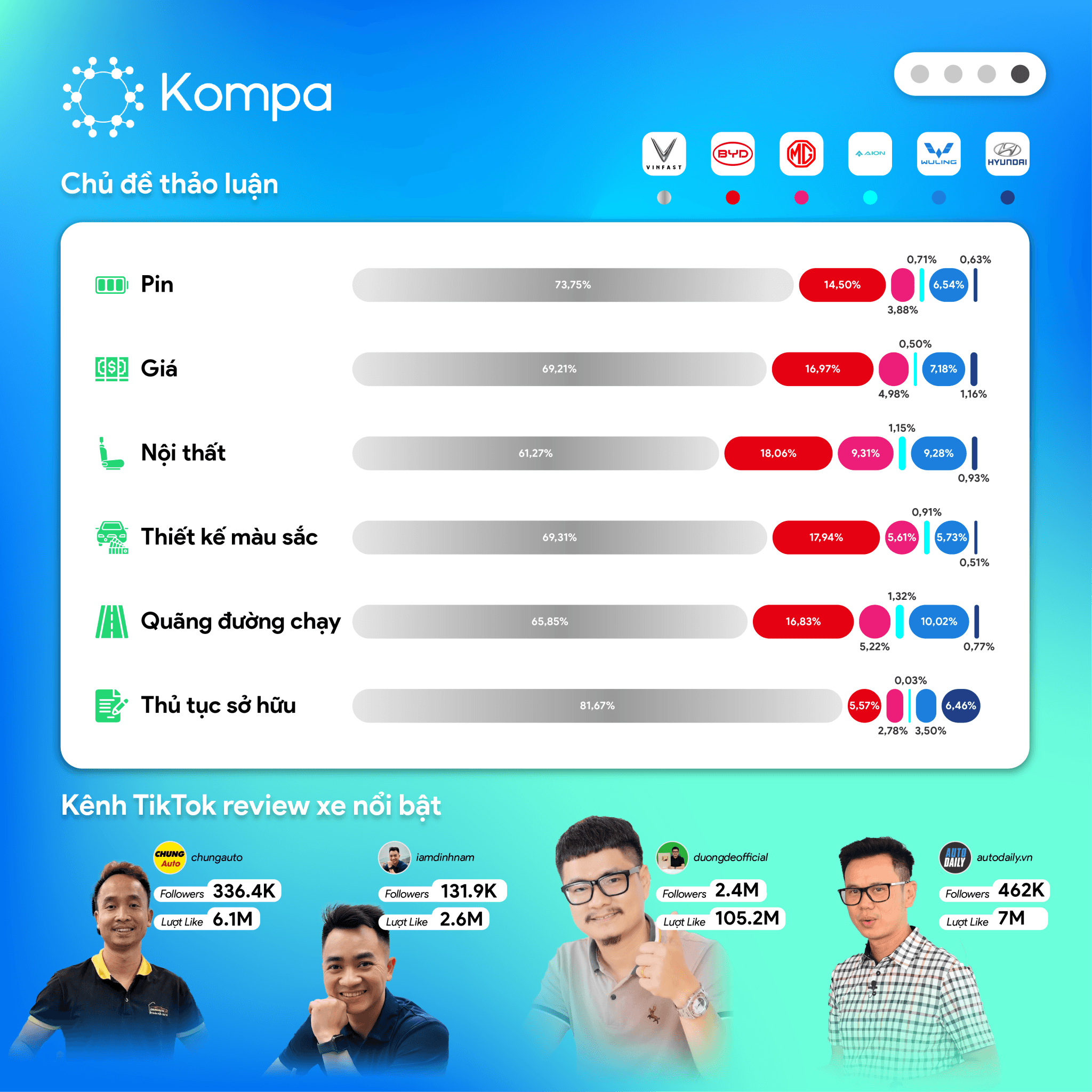 Một trong những yếu tố khiến Vinfast được nhắc đến nhiều là công nghệ Pin. Theo số liệu từ Social Listening, yếu tố Pin chiếm tỉ trọng 45% trong các cuộc thảo luận về Vinfast, đặc biệt khi so sánh với các dòng xe của đối thủ quốc tế như BYD. Điều này cho thấy người tiêu dùng không chỉ quan tâm đến thương hiệu mà còn đặc biệt chú ý đến các cải tiến công nghệ giúp tăng cường hiệu suất.