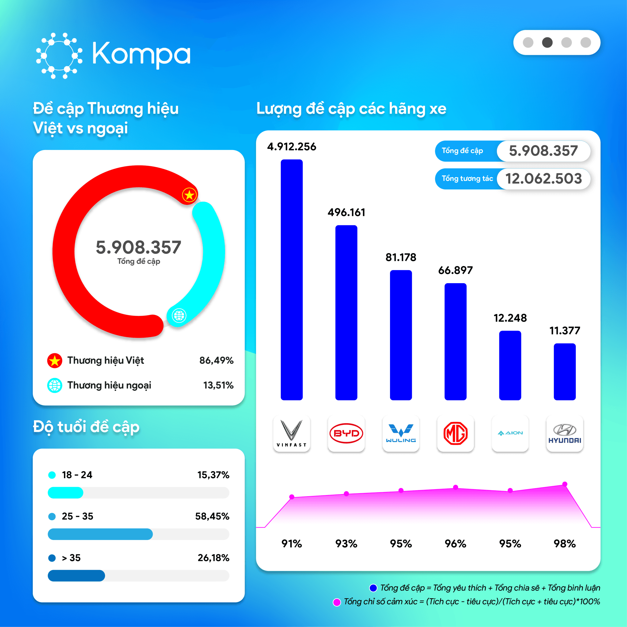 Thị trường ô tô điện, cả trong và ngoài nước, đang chứng kiến sự tăng trưởng mạnh mẽ, với hàng loạt thương hiệu nổi bật tham gia cuộc đua. Báo cáo này dựa trên dữ liệu Social Listening của Kompa, đo lường từ ngày 1.1.2024 đến 30.6.2024, sẽ trình bày những quan sát chính kèm theo số liệu chứng minh, giúp làm sáng tỏ những xu hướng đang định hình thị trường xe điện cũng như các đề xuất tham khảo cho Thương hiệu tham khảo trong quá trình định hướng thị trường hiệu quả.