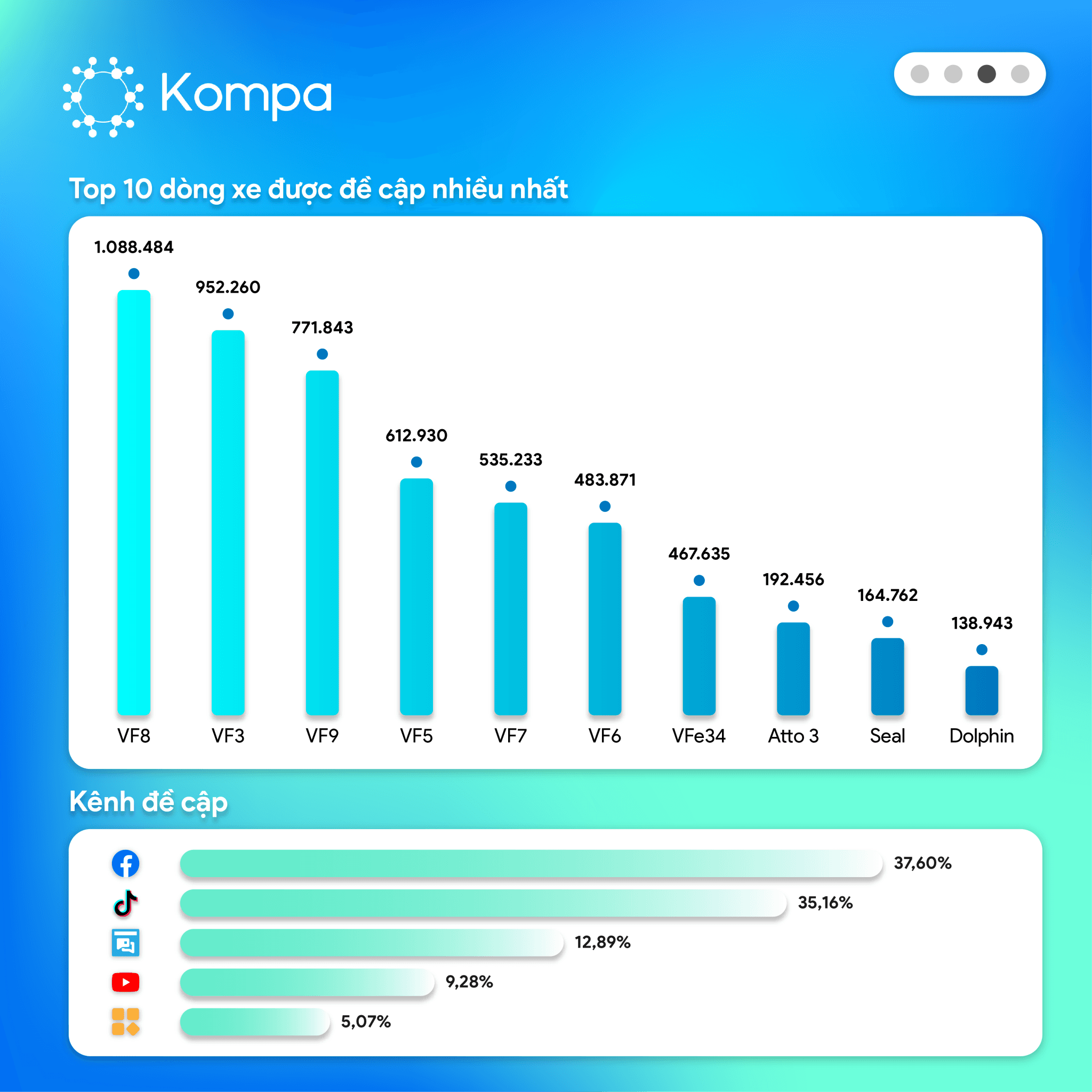 Vinfast tiếp tục duy trì vị thế dẫn đầu tại Việt Nam Từ các dòng xe như VFe34 và VF6, nhận được lần lượt 467.635 và 483.871 lượt đề cập. Bên cạnh đó, các mẫu xe VF7, VF5, VF9, VF3 và VF8 cũng đạt số liệu ấn tượng, với 1.088.484 lượt thảo luận cho VF8 và 952.260 lượt cho VF3.