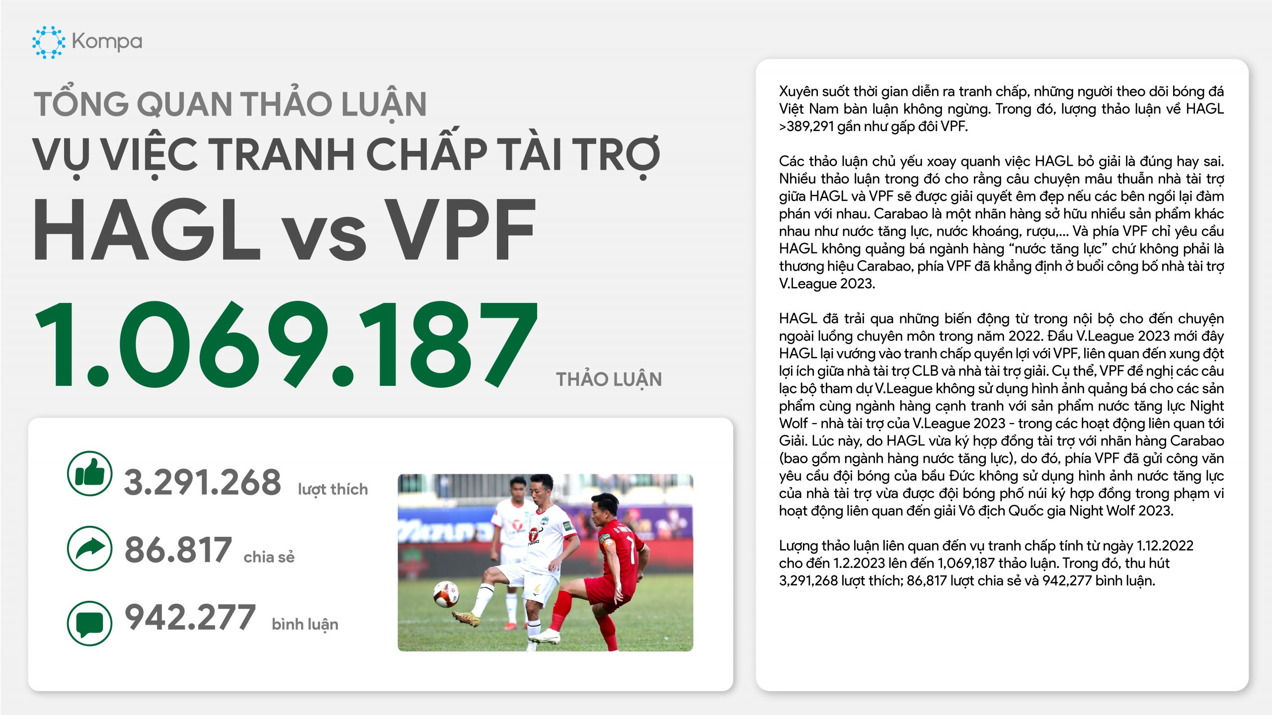 Sự việc thu hút đông đảo sự quan tâm của cộng đồng, với tổng lượng thảo luận 1,069,187. Nội dung thảo luận xoay quanh việc phân định đúng sai giữa hai bên HAGL & VPF. Theo các chuyên gia, vụ việc có thể giải quyết nếu các bên ngồi lại đàm phán với nhau.