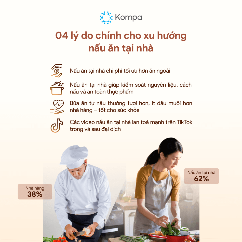 Hơn 62% người Việt trên mạng xã hội cho biết họ thường xuyên nấu ăn tại nhà – một con số vượt trội so với 38% chọn ăn ngoài, cho thấy sự dịch chuyển rõ rệt trong hành vi tiêu dùng sau đại dịch. Việc nấu ăn không còn chỉ xuất phát từ lý do tiết kiệm, mà dần trở thành biểu hiện của lối sống lành mạnh và chủ động.