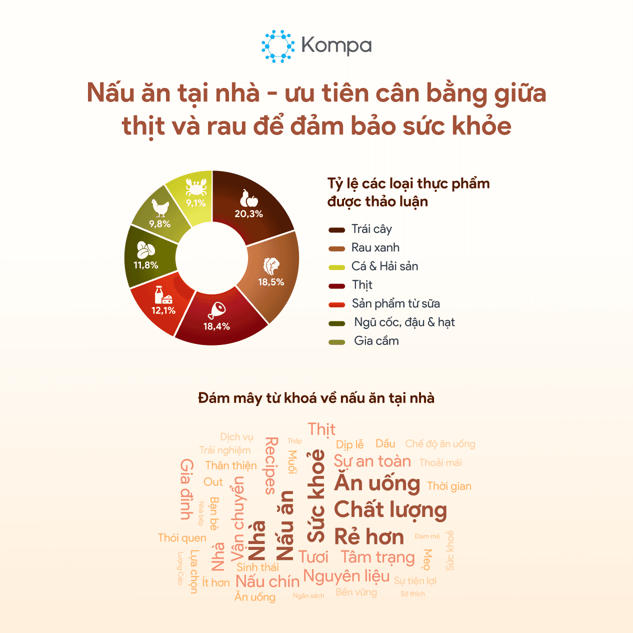 Báo cáo đã chỉ ra 4 động lực chính, trong đó việc kiểm soát nguyên liệu, phương pháp chế biến và đảm bảo an toàn thực phẩm là yếu tố nổi bật thứ hai, chỉ sau yếu tố tiết kiệm chi phí. Ngoài ra, từ khóa xuất hiện nhiều trong về nấu ăn tại nhà bao gồm “Sức khỏe”, “Chất lượng”, “Nguyên liệu”, “An toàn” – cho thấy rõ người tiêu dùng quan tâm đến việc làm chủ bữa ăn hơn là chỉ đáp ứng nhu cầu ăn no.