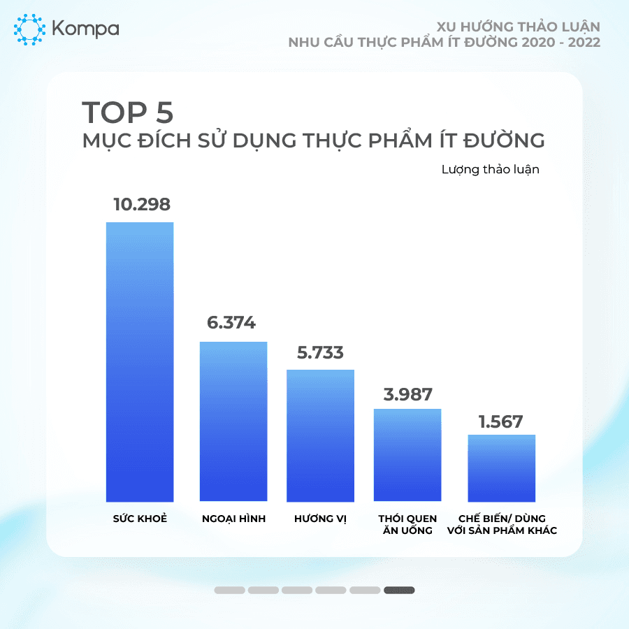 Mục đích sử dụng thực phẩm ít đường vì sức khỏe được ưu tiên hàng đầu với 10.298 thảo luận. Sức khỏe của bé và mẹ được quan tâm thảo luận hàng đầu như: cân nặng, sức đề kháng, hệ tiêu hóa của trẻ, sức khỏe của mẹ trong và sau thai kỳ. Các mẹ có xu hướng sử dụng thực phẩm ít đường trong thực đơn hàng ngày để tăng cân cho thai nhi và trẻ.