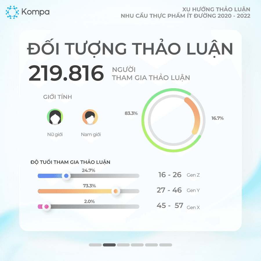 Có 219.816 người tham gia thảo luận về chủ đề ít đường trên toàn Việt Nam. Trong đó 83.3% là nữ giới. Độ tuổi quan tâm đến chủ đề nhiều nhất là từ 27 – 46 tuổi. 24.7% Gen Z tham giao thảo luận quan tâm đến vấn đề ít đường, là tệp khách hàng tiềm năng các nhãn hàng có thể hướng đến.