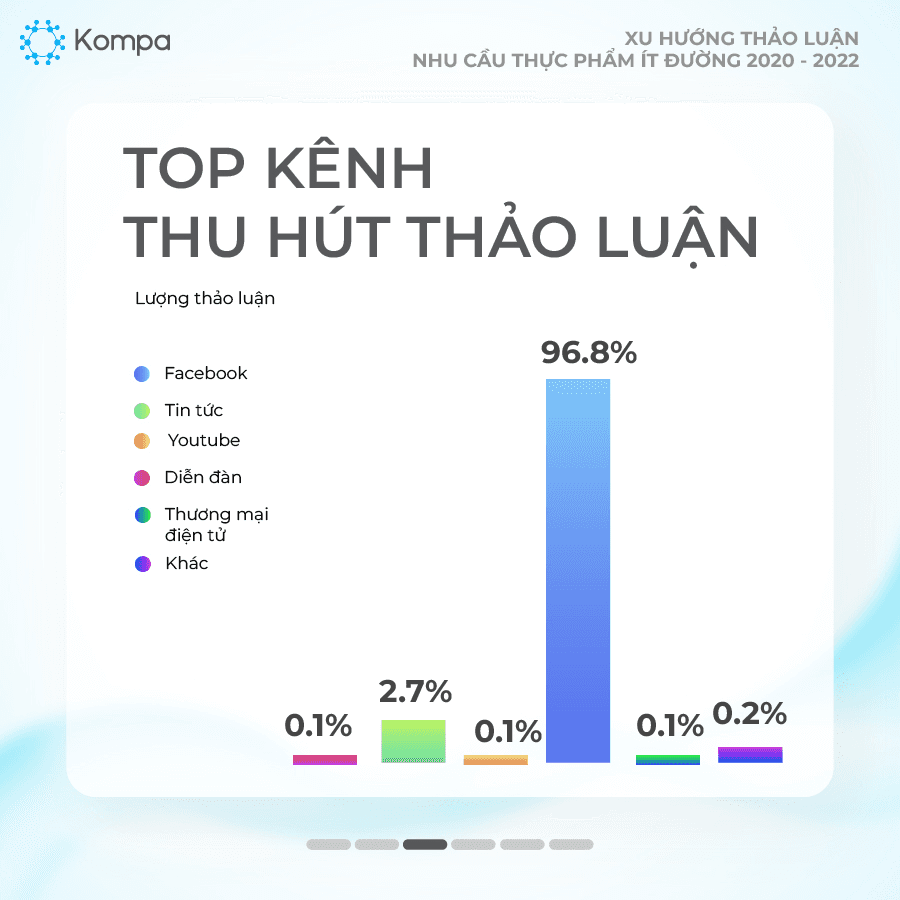 Gần 97% tổng thảo luận về nhu cầu thực phẩm ít đường tập trung chủ yếu trên Facbook. Chủ đề thảo luận sôi nổi bởi người dùng Facebook chiếm 40.2%; 39.7% lượng thảo luận đến từ các nhóm facebook như YÊU BẾP (Esheep Kithcen Family), Thánh Riviu, Hà Nội ăn gì? Ở đâu?, Ăn sập Sài Gòn, Học viện Bếp Bánh (miễn phí)…; các trang Facebook tạo ra 23.9% lượng thảo luận điển hình như fanpage KOL Thư Nguyễn, fanpage Ăn chơi Vũng Tàu, Food in Việt Nam, Thoa Vo, Vinamilk – Vui khỏe mỗi ngày…